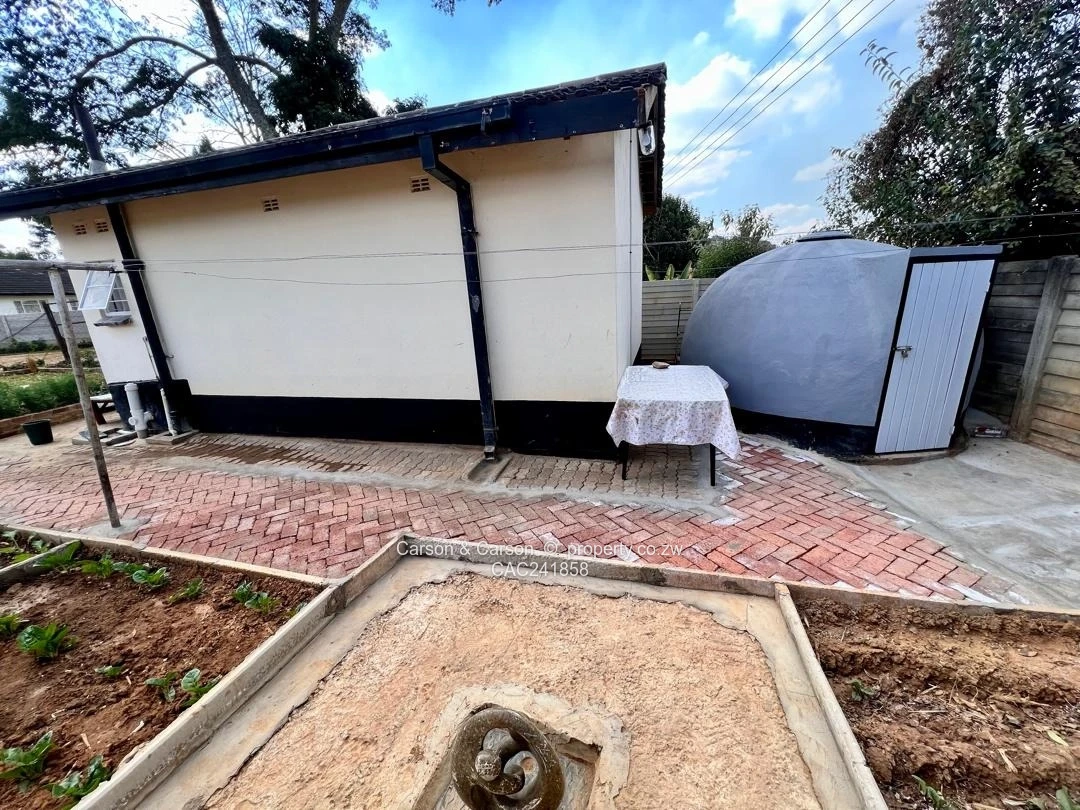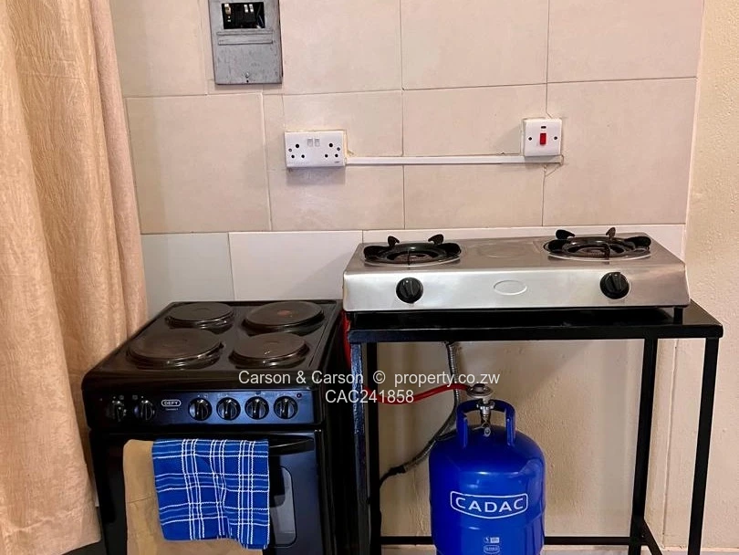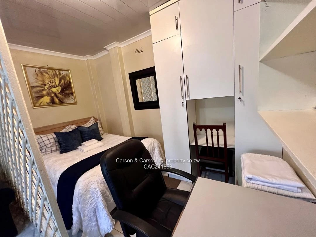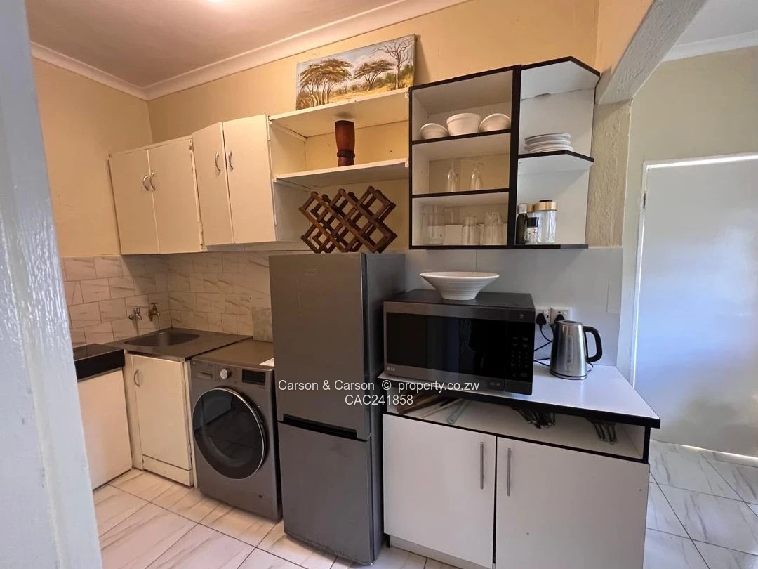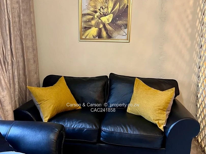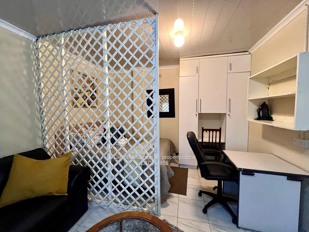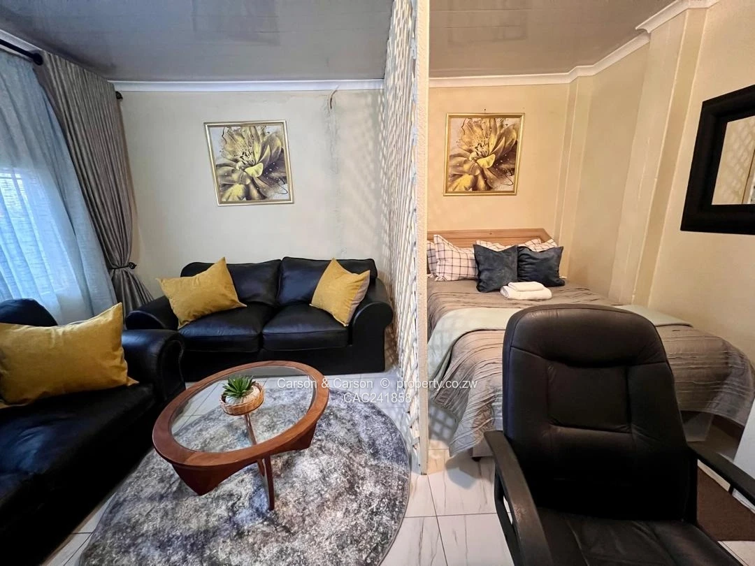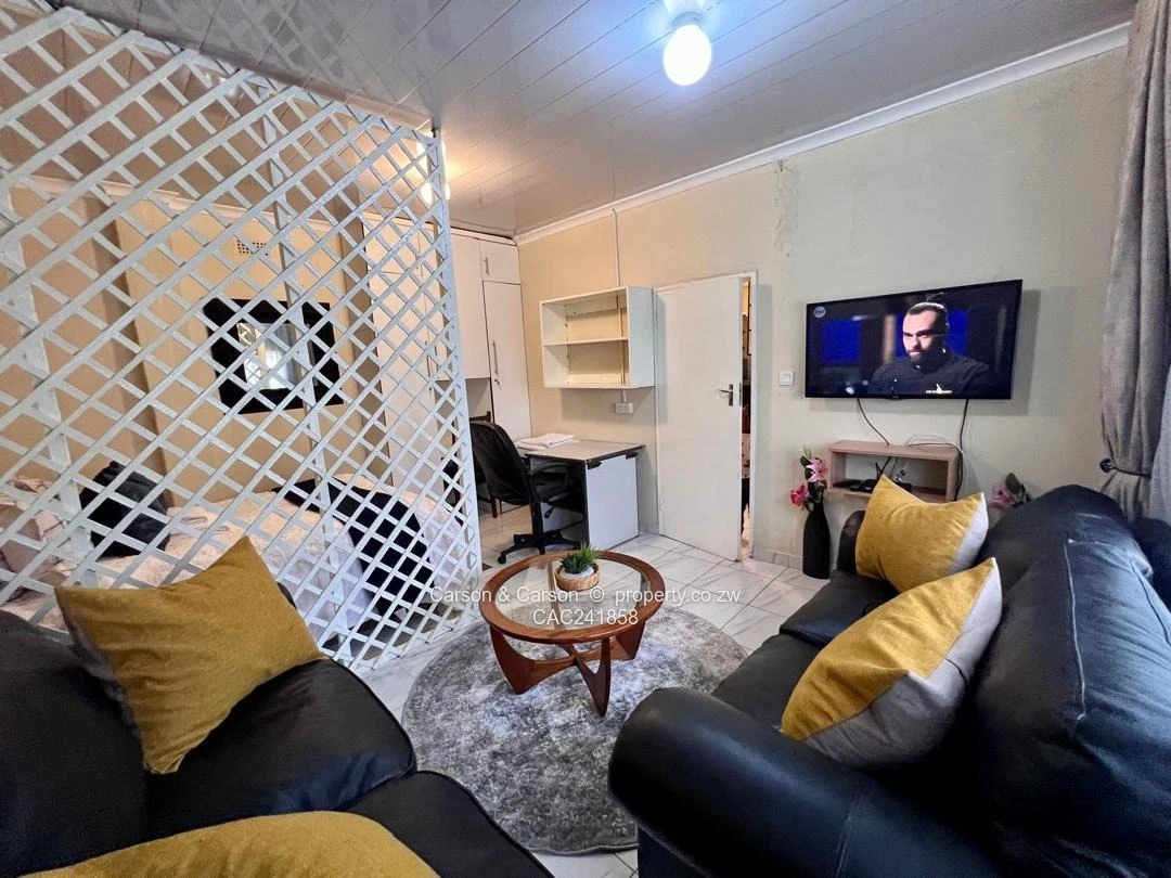 Charming fully furnished 1-bedroom, 1-bath cottage for rent in The Grange, Harare North — perfect for a single professional or couple seeking comfort and convenience. Set on a neat 180 m² stand with 120 m² of well-appointed living space, the cottage greets you with a private lawn edged by flowering plants and a distinctive circular blue garden structure that adds character to the outdoor area. Inside, the compact open-plan layout is smartly organised: a cosy sitting area with a black leather sofa and yellow accent cushions sits opposite a small dining/coffee table, while a lattice divider creates a defined sleeping nook with a comfortable double bed. The kitchenette is fully equipped with ample cabinetry, fridge, microwave, kettle and a washing machine, plus tile flooring and contemporary neutral finishes throughout. A dedicated workspace with desk and swivel chair makes working from home effortless. Additional highlights include a reliable borehole water supply, tasteful décor and soft furnishings, built-in storage, and easy-to-maintain paved pathways. Secure, quiet and ready to move into — this cottage blends practical amenities with warm, stylish living in a sought-after Harare North location. Wi-Fi is also available and viewing is strictly by appointment.