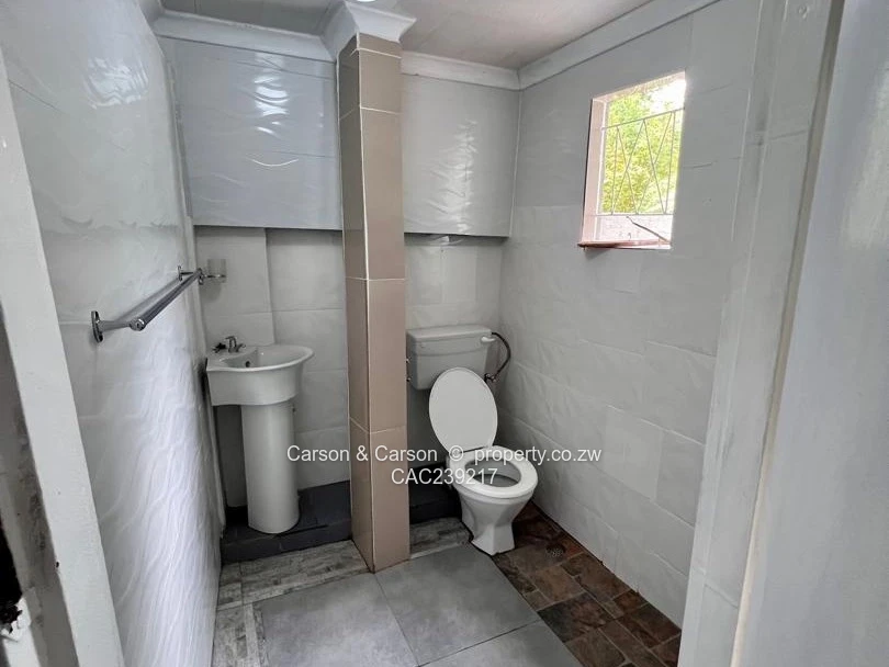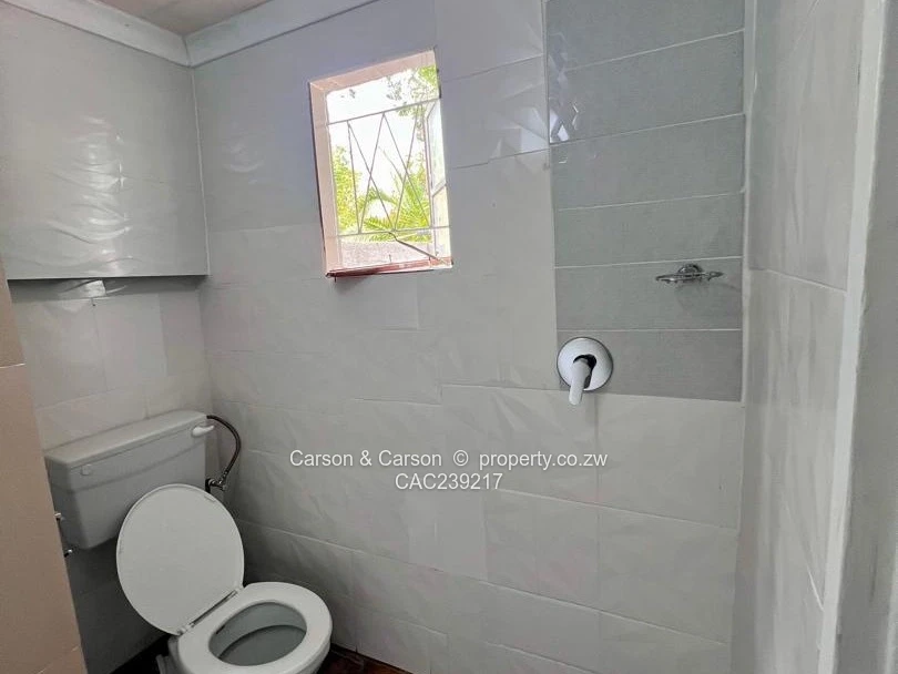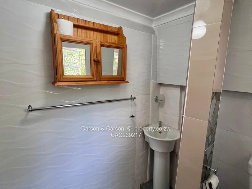 The kitchenette is efficient and contemporary with glossy tiled walls, grey fitted cabinets, a stainless sink, microwave, kettle and a two-burner gas hob — ideal for quick meals and everyday living. The tiled bathroom is clean and fresh, equipped with a pedestal basin, toilet and a shower area, plus a small barred window and a wooden mirrored cabinet for storage. this is for bed and breakfast only at $ 45 a day.