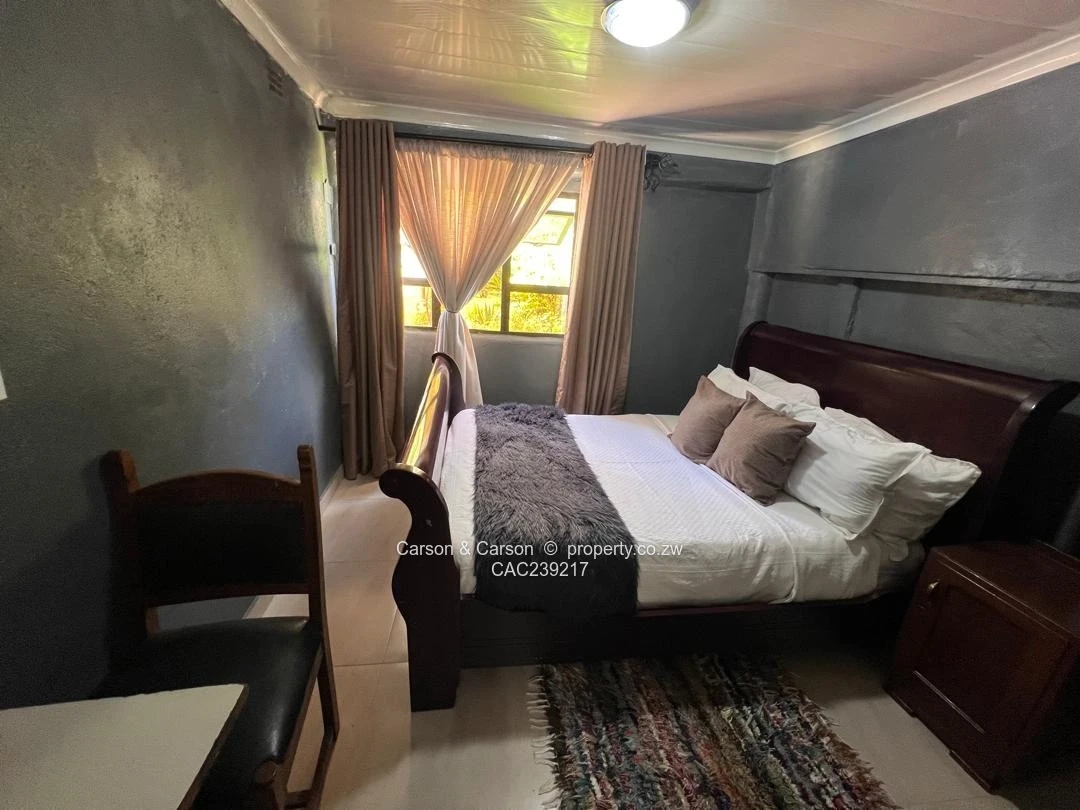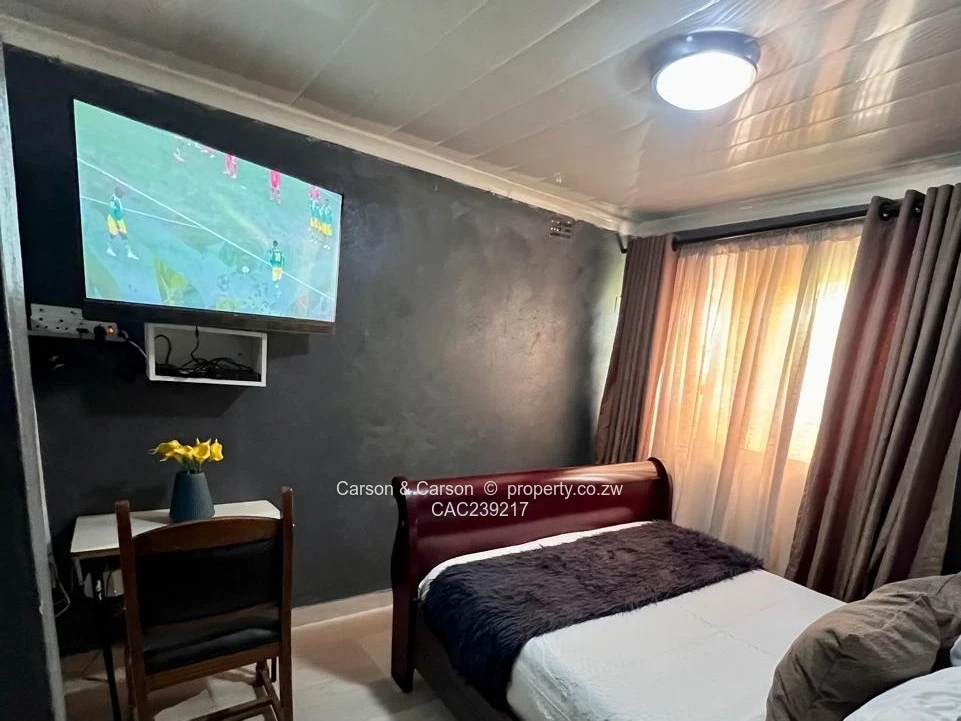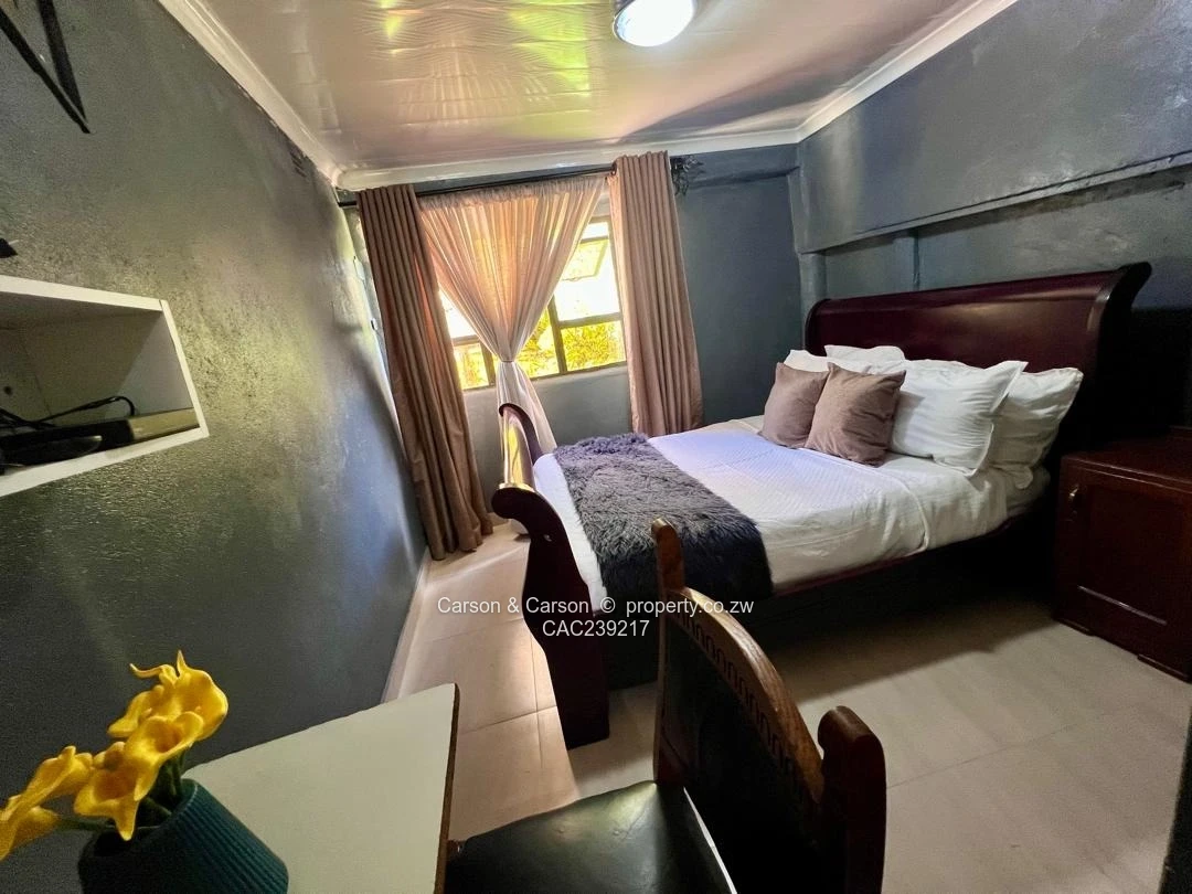 Charming fully furnished 1-bedroom, 1-bath house to rent in The Grange, Harare North — perfect for a single professional or couple. This smartly fitted unit maximises space and comfort. The bedroom (see photos) features a mahogany sleigh bed dressed in crisp white linen, plush cushions and a soft faux-fur runner against stylish charcoal-painted walls; a wall-mounted TV, built-in wardrobe and a small desk with chair create a neat work-and-relax zone. Natural light filters through layered curtains, while a modern PVC ceiling light keeps the room bright.