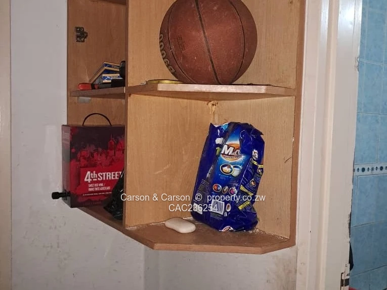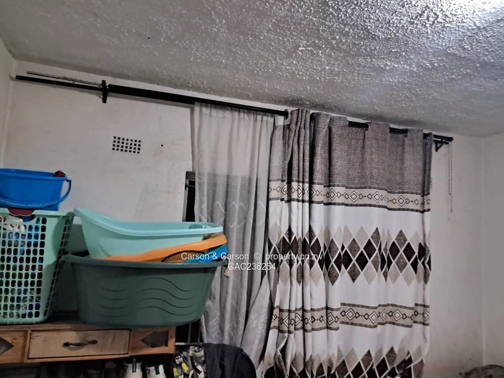 Spacious 2-bedroom, 1-bath apartment for sale in Ardbennie, Harare South — a well-situated unit offering 150 m² of covered living on an exceptional 10,000 m² stand. This property combines solid bones with great upside: secure iron gate entry and brick exterior (see front security gate photo), a comfortable lounge with patterned curtains and ample natural light (living area images), and practical built-in shelving and storage off the hallway ideal for shoes and laundry supplies.