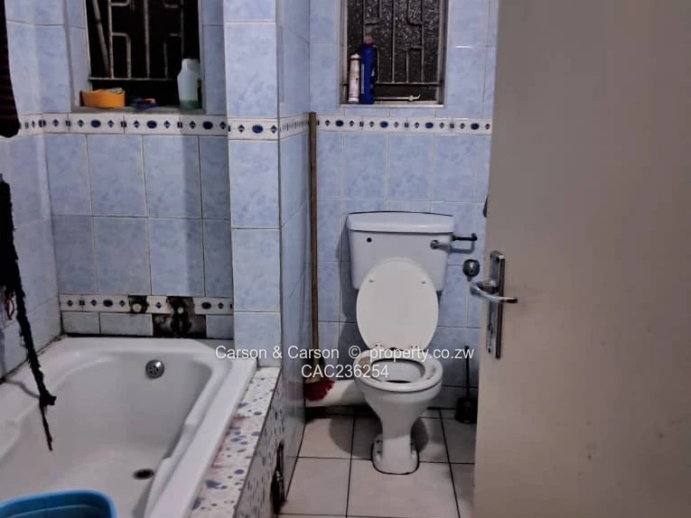 The bathroom is fully tiled and fitted with a bath and WC, ready for immediate use (bathroom photo). Interior details include textured ceilings, tiled floors and a compact service area where appliances can be placed. A reliable borehole on the property ensures independent water supply — a key advantage in Harare South.
