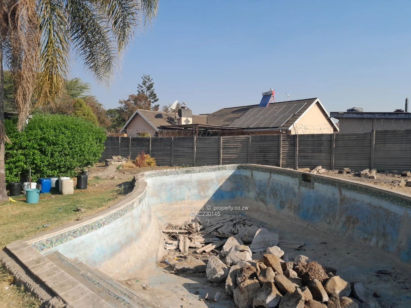 This substantial property boasts an impressive layout, comprising a spacious lounge, elegant dining room, and well-appointed kitchen, accompanied by three generously proportioned bedrooms and a sleek bathroom. Additional features include a disused swimming pool, ripe for revitalization, and double staff quarters, offering ample scope for redevelopment.