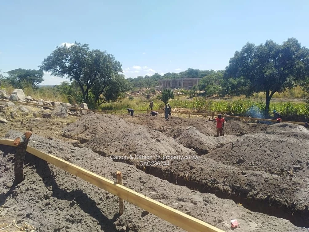 Vacant 1000 m² residential stand for sale in sought-after Crowhill Views, Harare North. This gently undulating, cleared site offers commanding valley and skyline views framed by mature indigenous trees and attractive granite outcrops — perfect for a contemporary family home or executive retreat. The stand is pegged and foundation trenches have already been started (as shown in the photos), speeding your build-in-time and reducing pre-construction delays. The parcel benefits from an elevated position with excellent natural drainage, natural rock features that can be incorporated into landscaping, and easy on-site access for contractors (workers pictured). Located in a quiet, developing neighbourhood with neighbouring quality builds visible from the plot, this is an ideal investment or owner-builder opportunity close to Harare North conveniences. Secure this stand now and start designing your dream home with panoramic Crowhill Views. Contact us to arrange viewing and site plans.